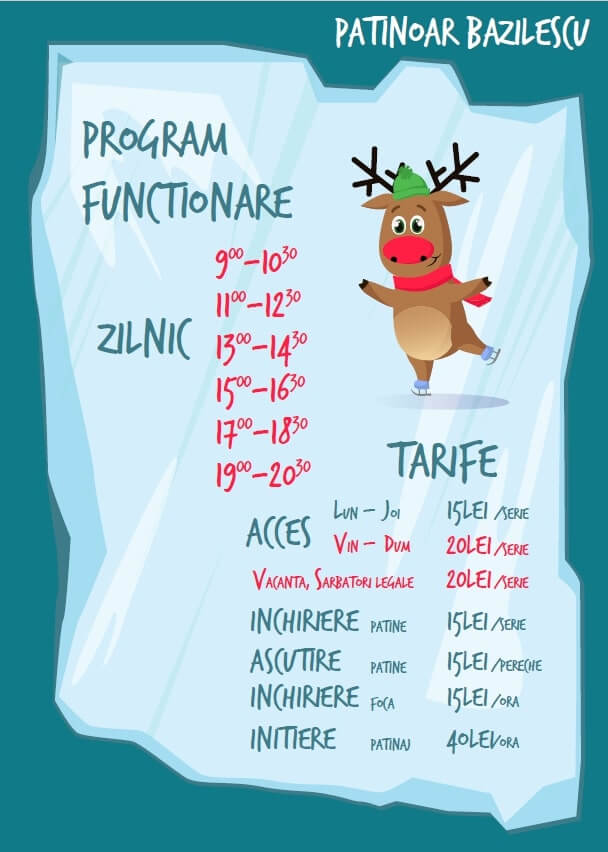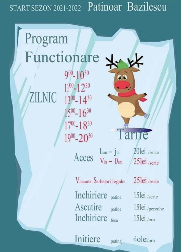 EDIT: Pentru sezonul 2021-2022 la patinoar din Parcul Bazilescu din București au fost schimbate puțin prețurile. Mai jos găsiți poza cu program și prețuri.